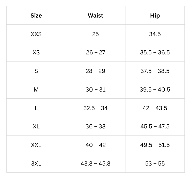 Size Chart (inches):