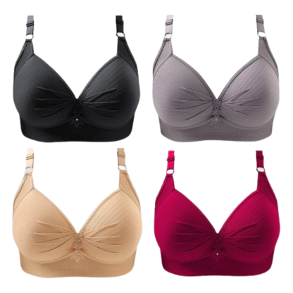Experience unparalleled comfort and style with the Pack of 4 Wireless Bra Set. This thoughtfully curated set includes four versatile colors—black, gray, beige, and red—to complement a wide range of outfits and occasions. Designed for all-day wear, these bras feature a wire-free structure that provides natural support and ensures maximum comfort. The ruched front with delicate lace accents and a charming decorative detail adds a touch of elegance.