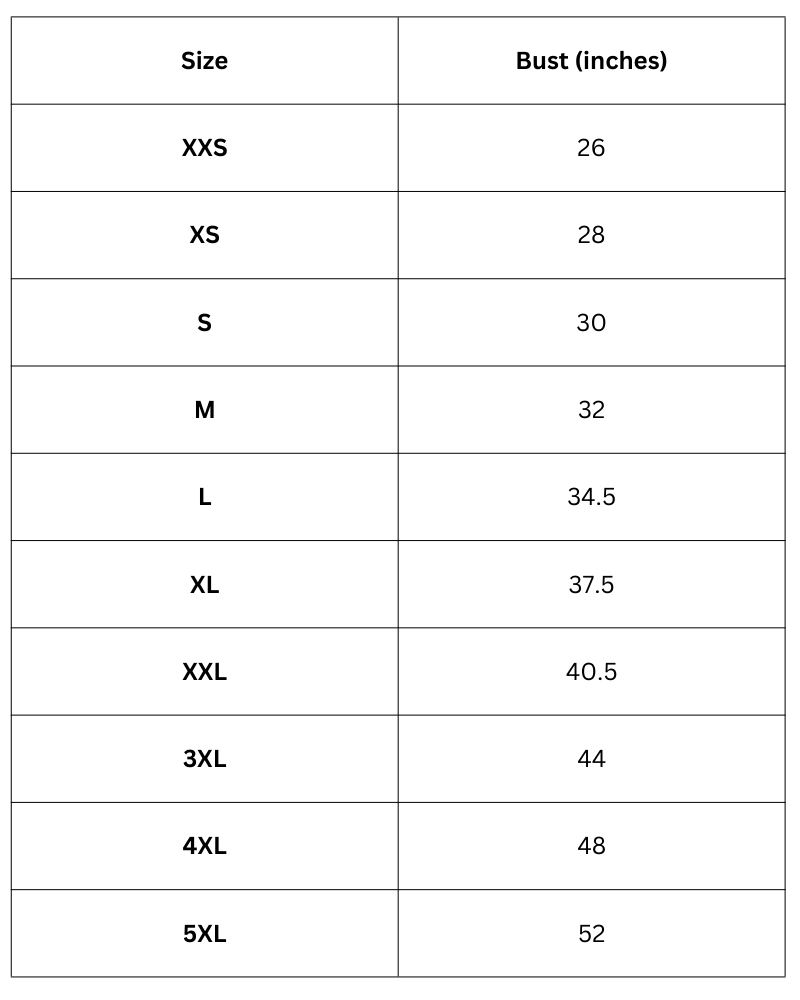 Size Chart in Inches: